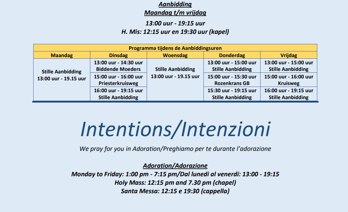 Monday to Friday after Holy Mass from 12:15 to 7:15 p.m.